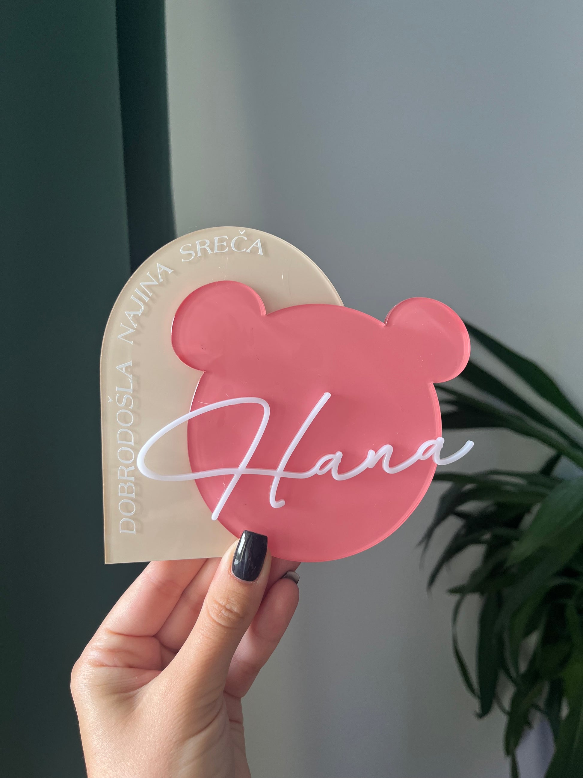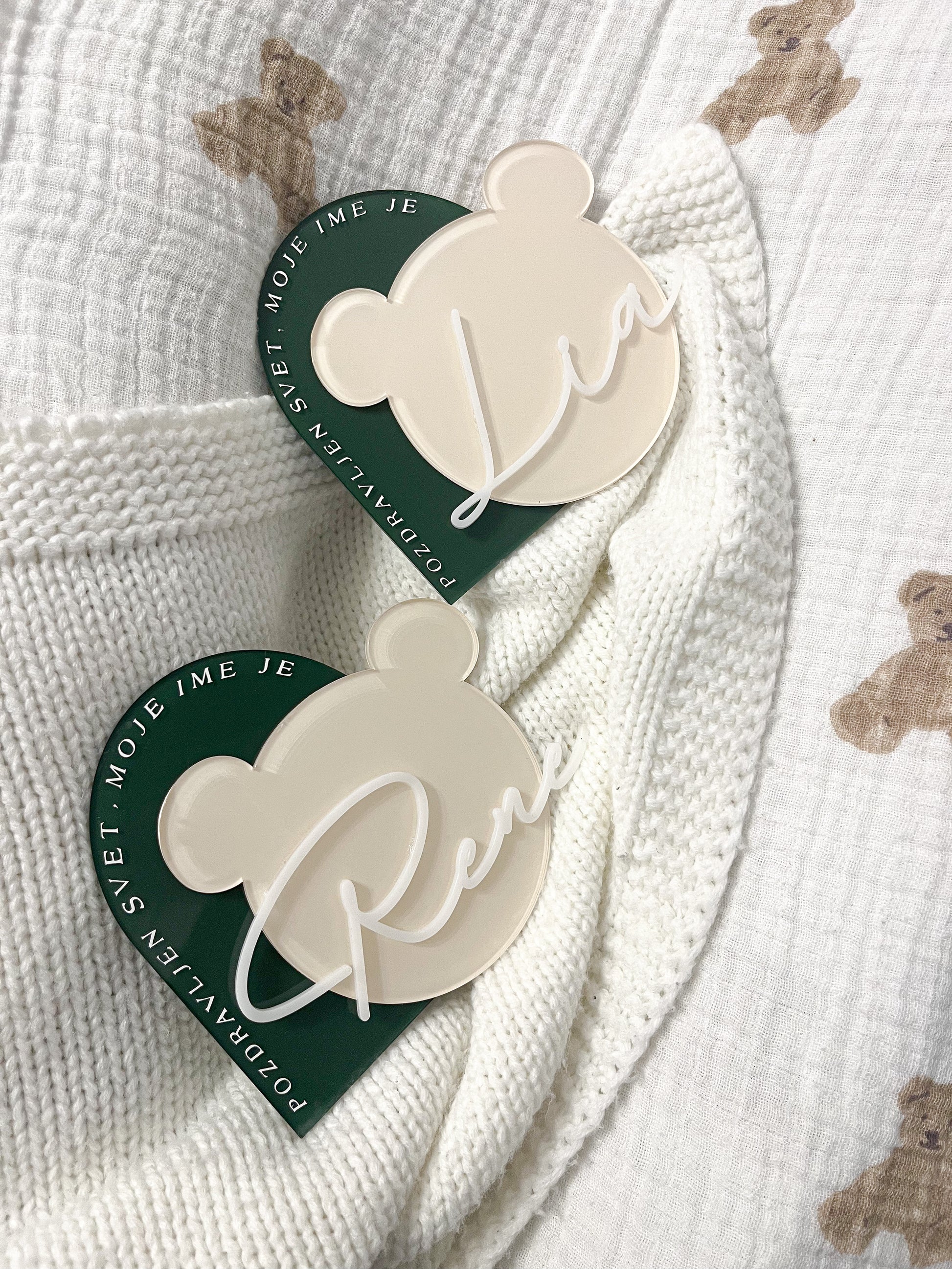 Izberite barvo in besedilo, ki ga želite imeti pri polovalni ploščici ter barvo in ime pri ploščici z obliki medvedka. Besedilo in 3D ime je napisano v beli barvi in s pisavo kot je na sliki. Za drugačne želje nam pišite na info@lapin.si.