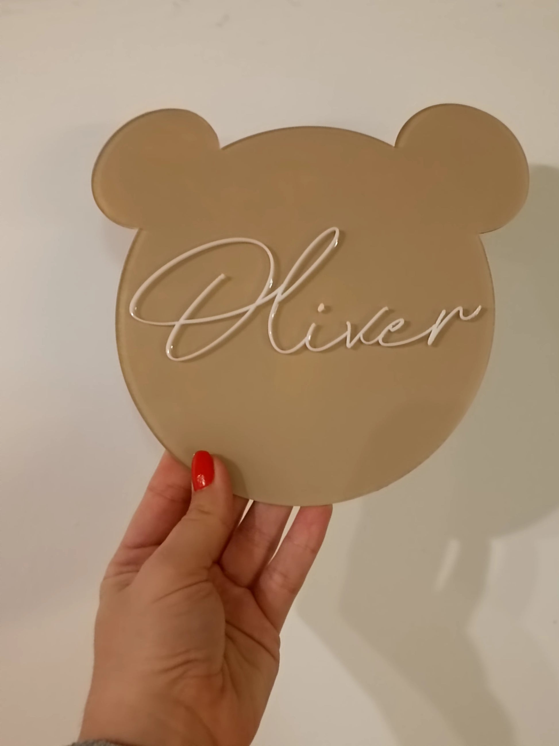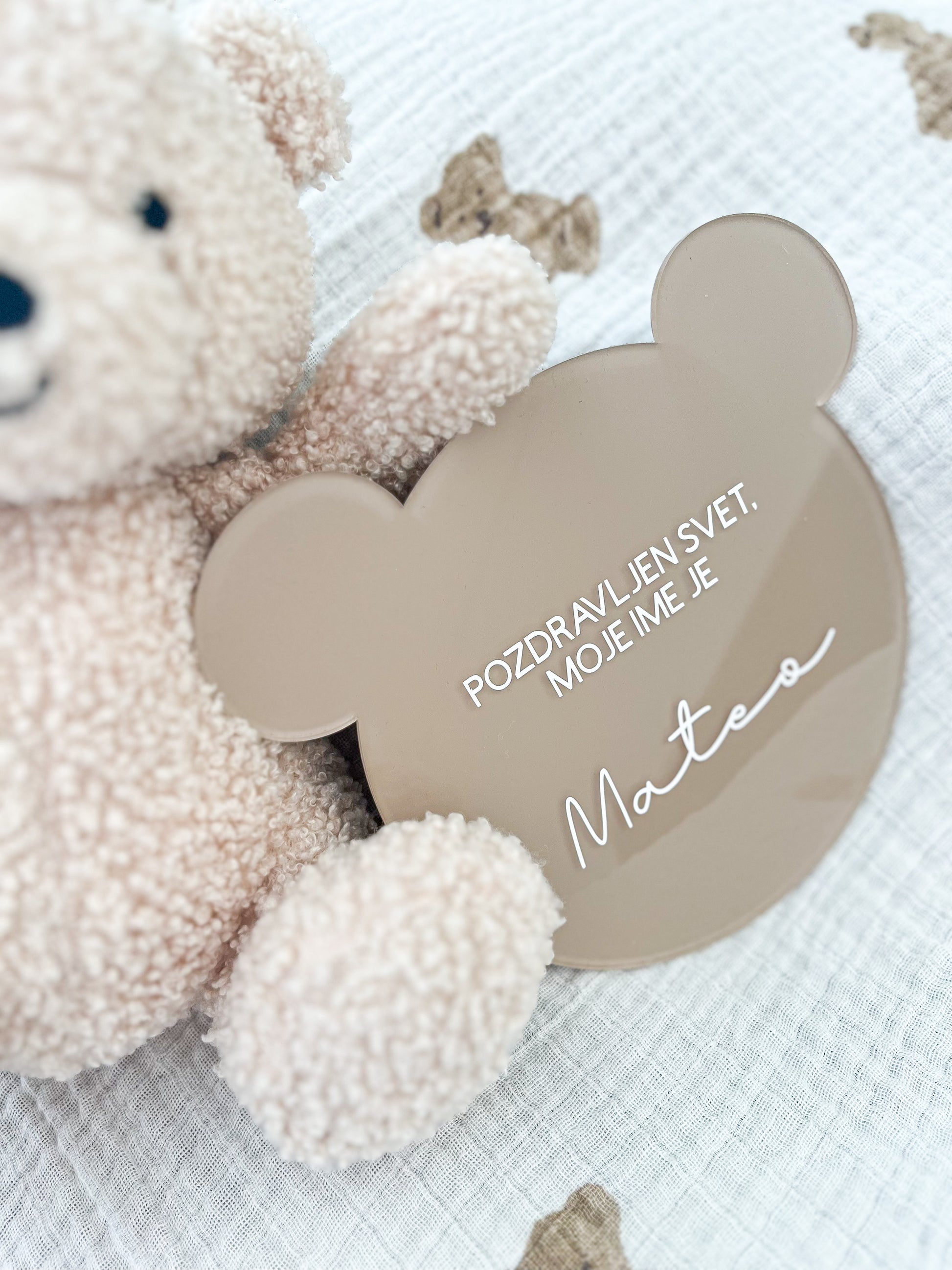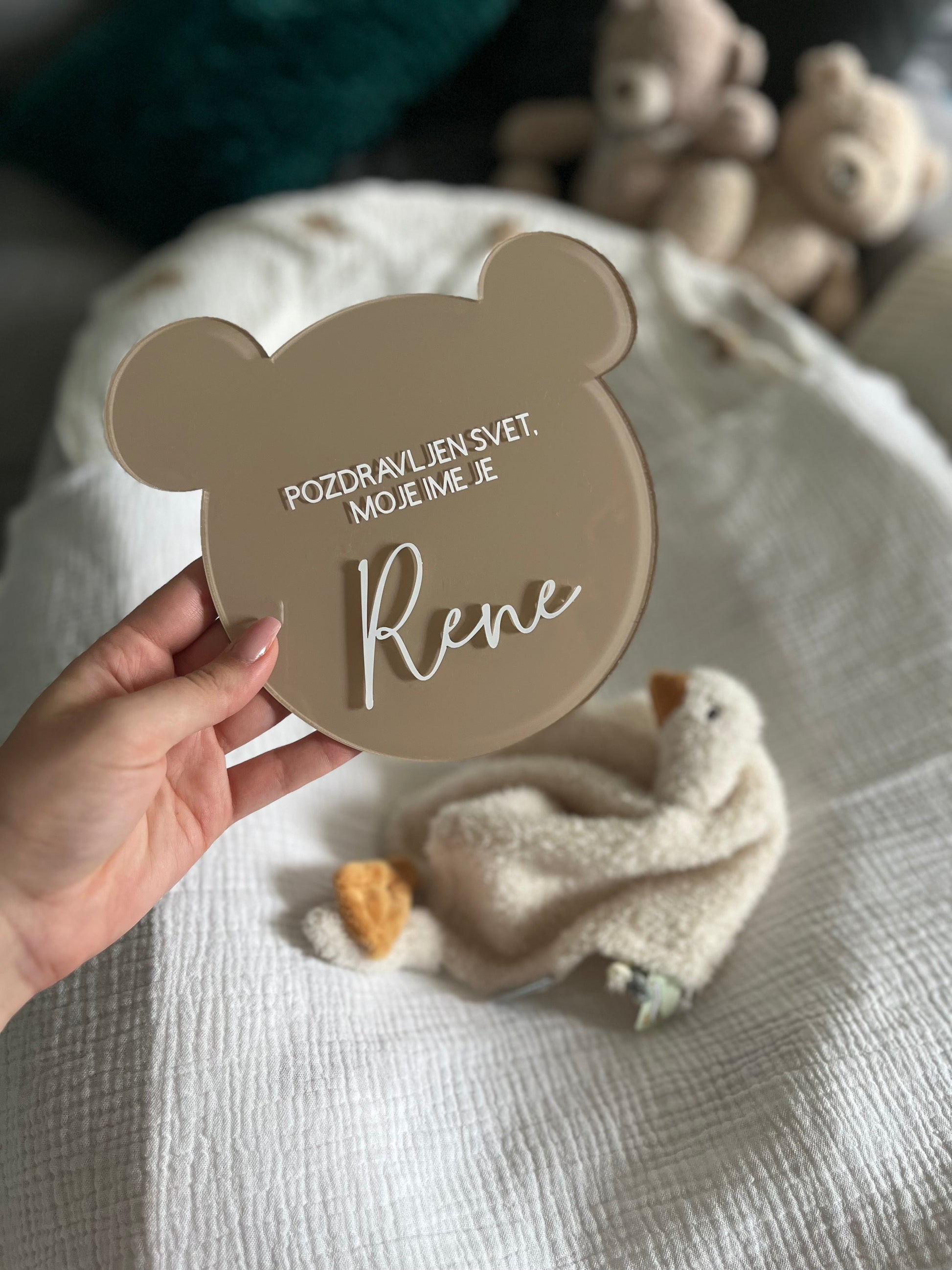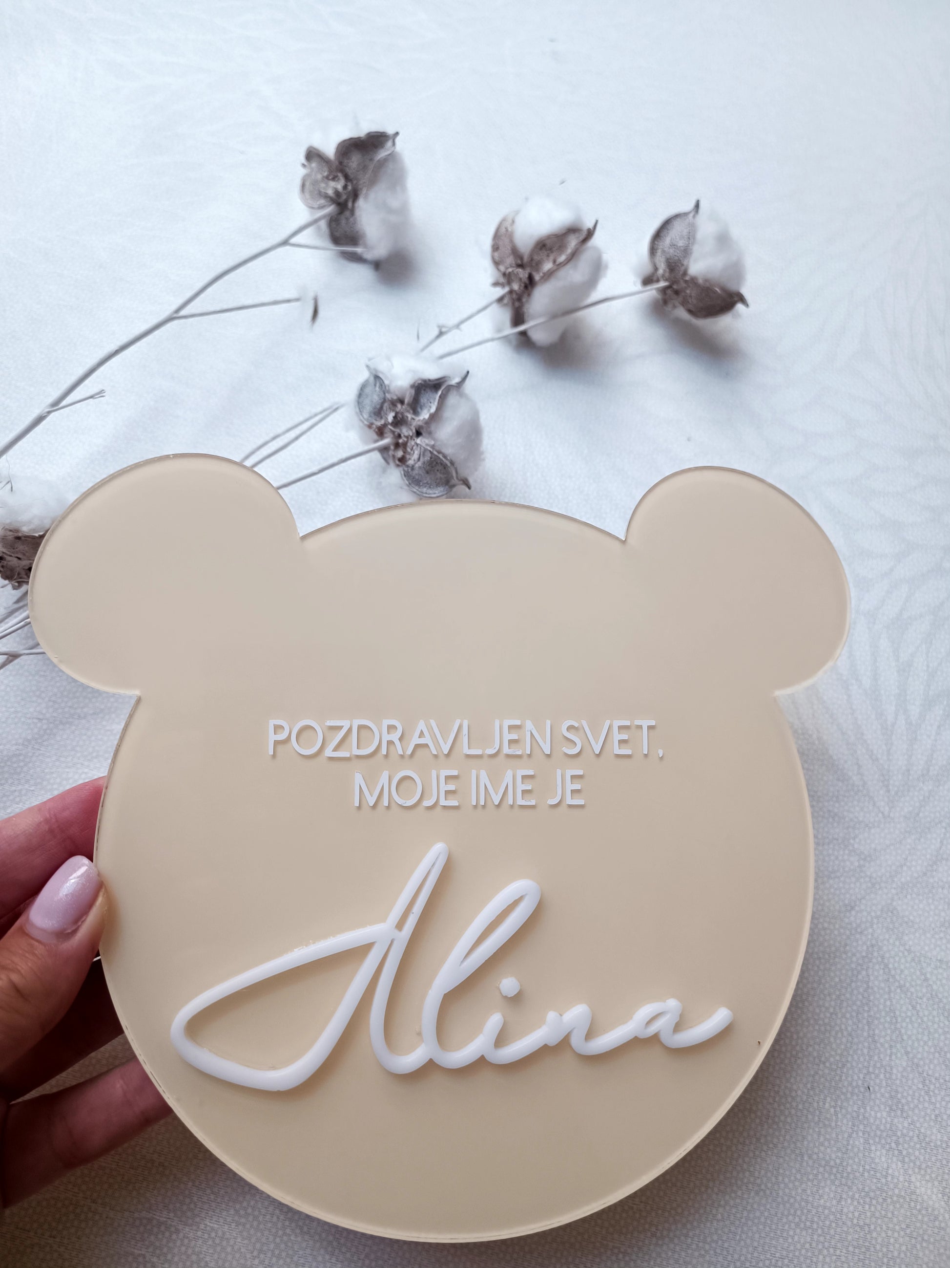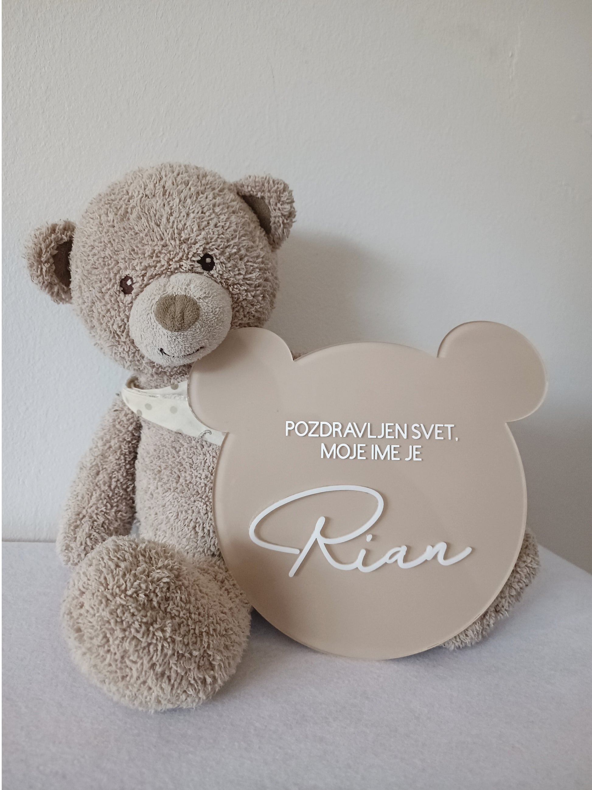 Izberite barvo ploščice in besedilo, ki ga želite imeti. Besedilo je napisano s pisavo kot je na sliki. V okvirček napišite ime otroka ter označite ali želite imeti napisano 3D ime. Za drugačne želje nam pišite na info@lapin.si.