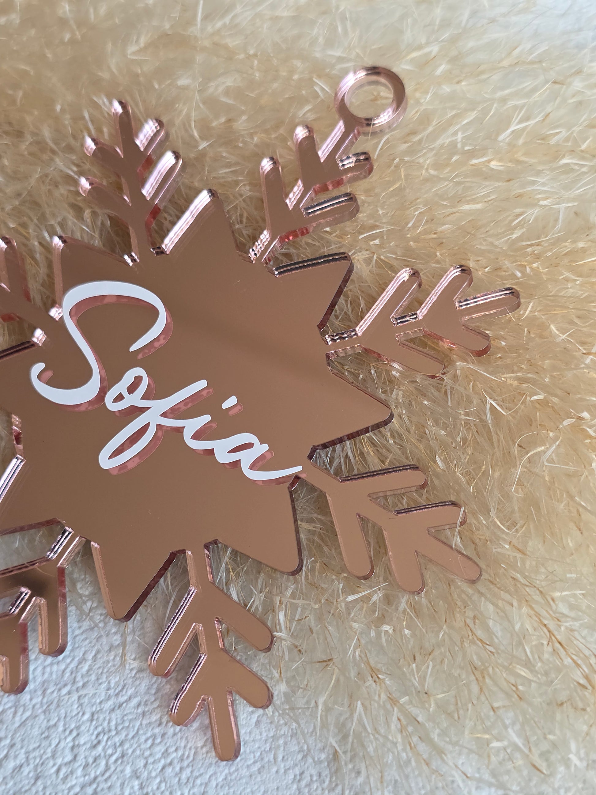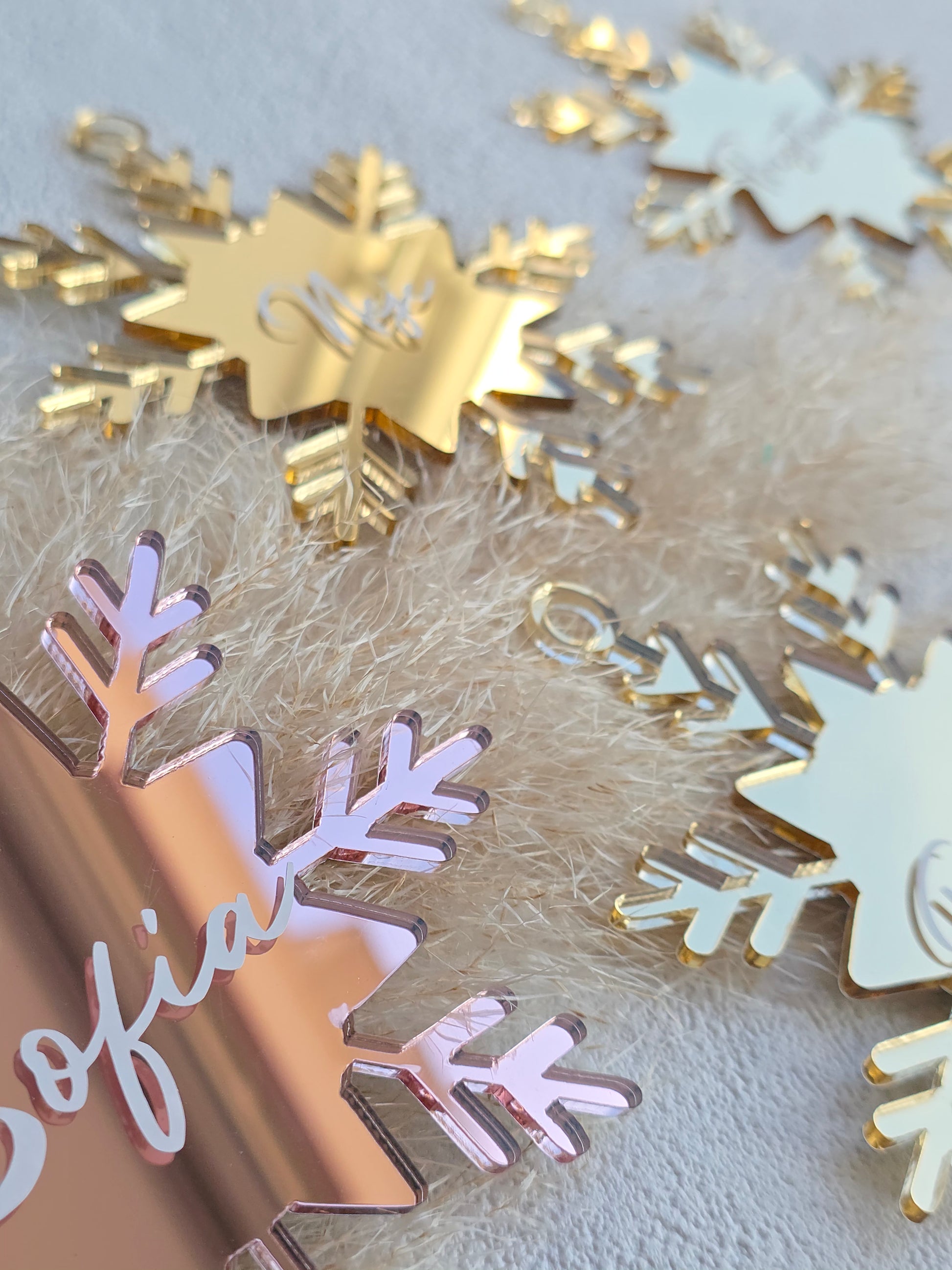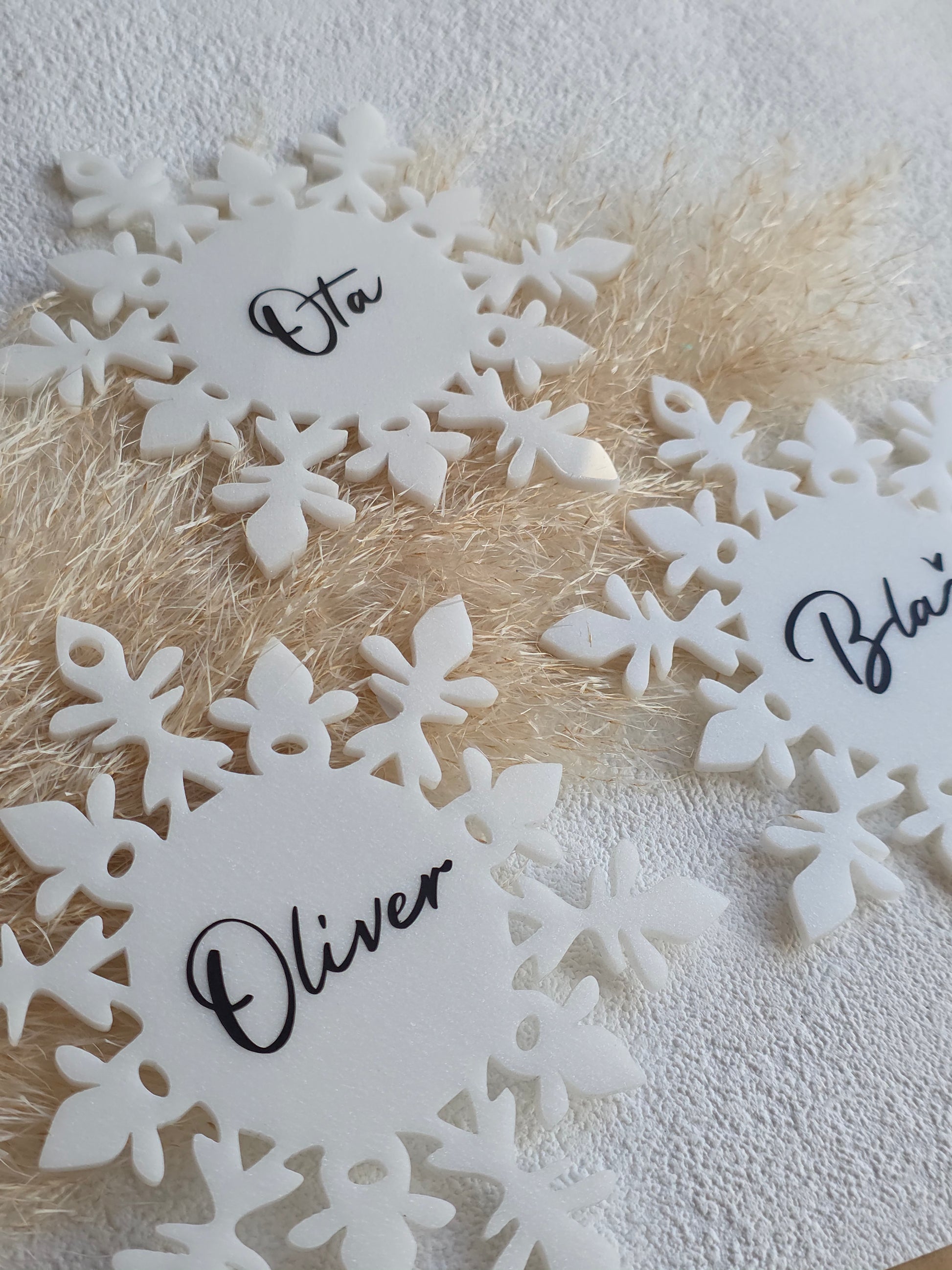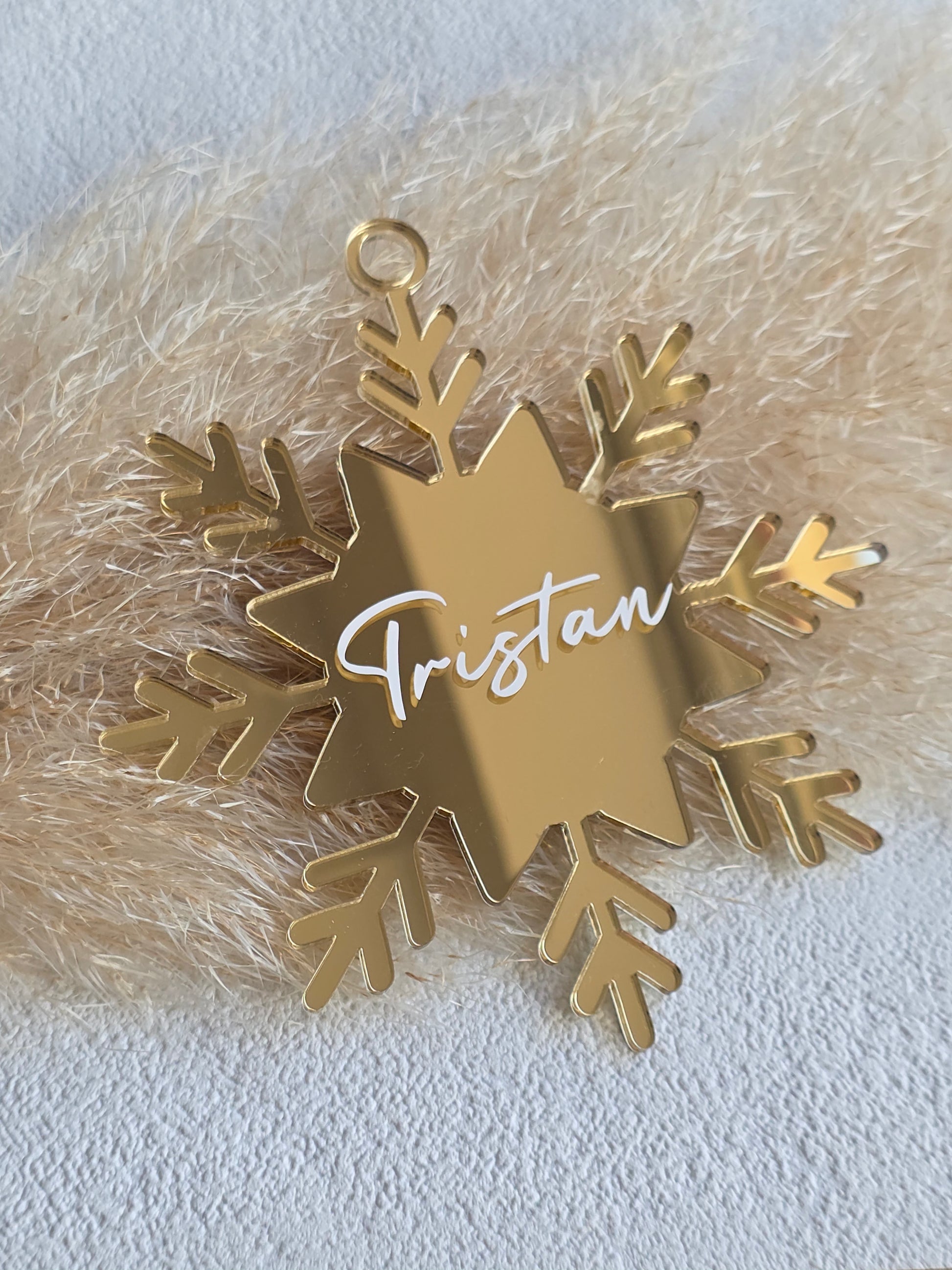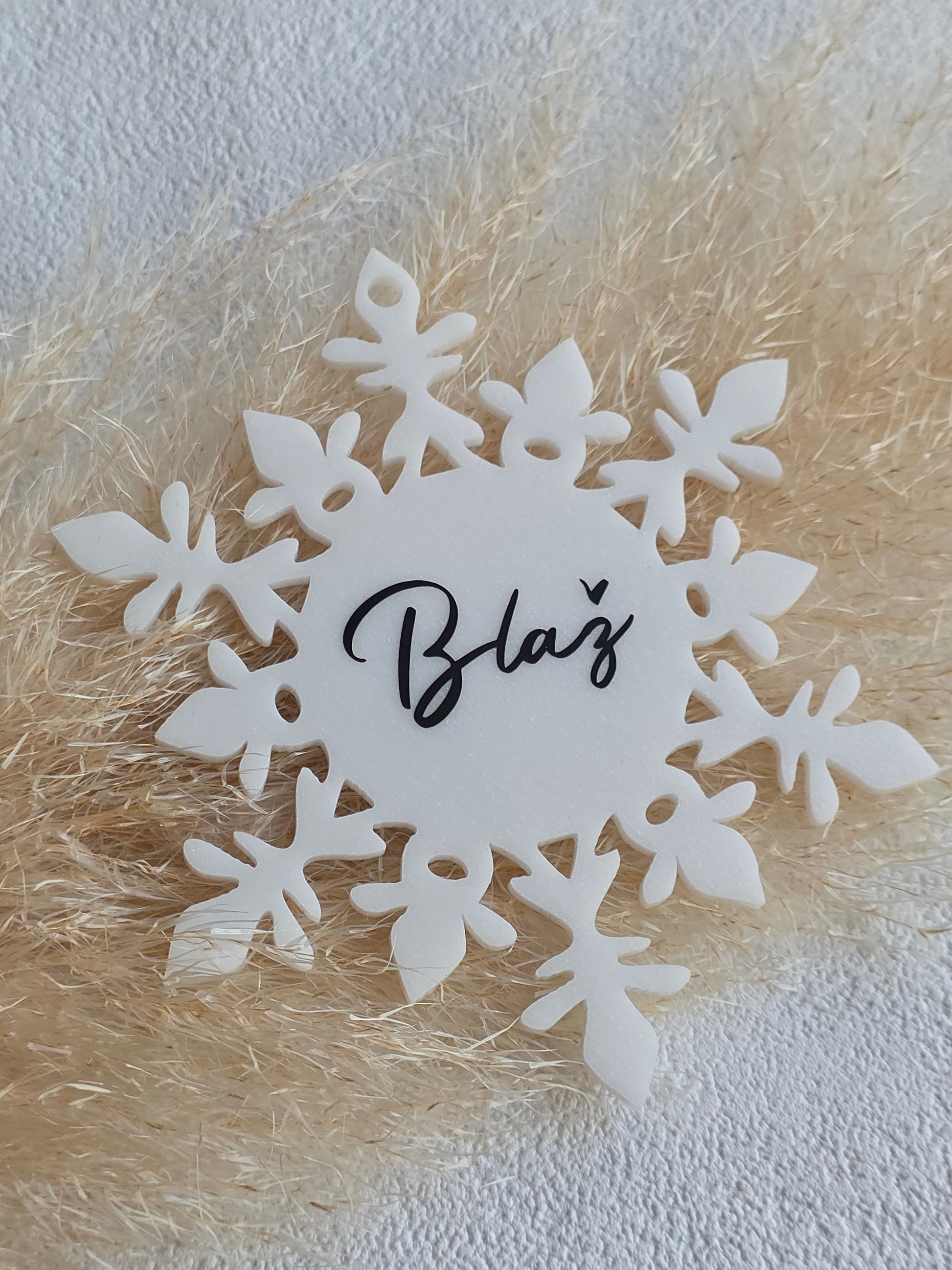 Izdelana je iz kakovostnega akrilnega stekla, ki čudovito lovi svetlobo in na drevesu ustvarja kristalen sij. Na snežinko dodamo ime po želji, zaradi česar postane edinstven spomin – bodisi za vaš dom, za otroka, prvi božič, ali kot posebno darilo za najdražje.