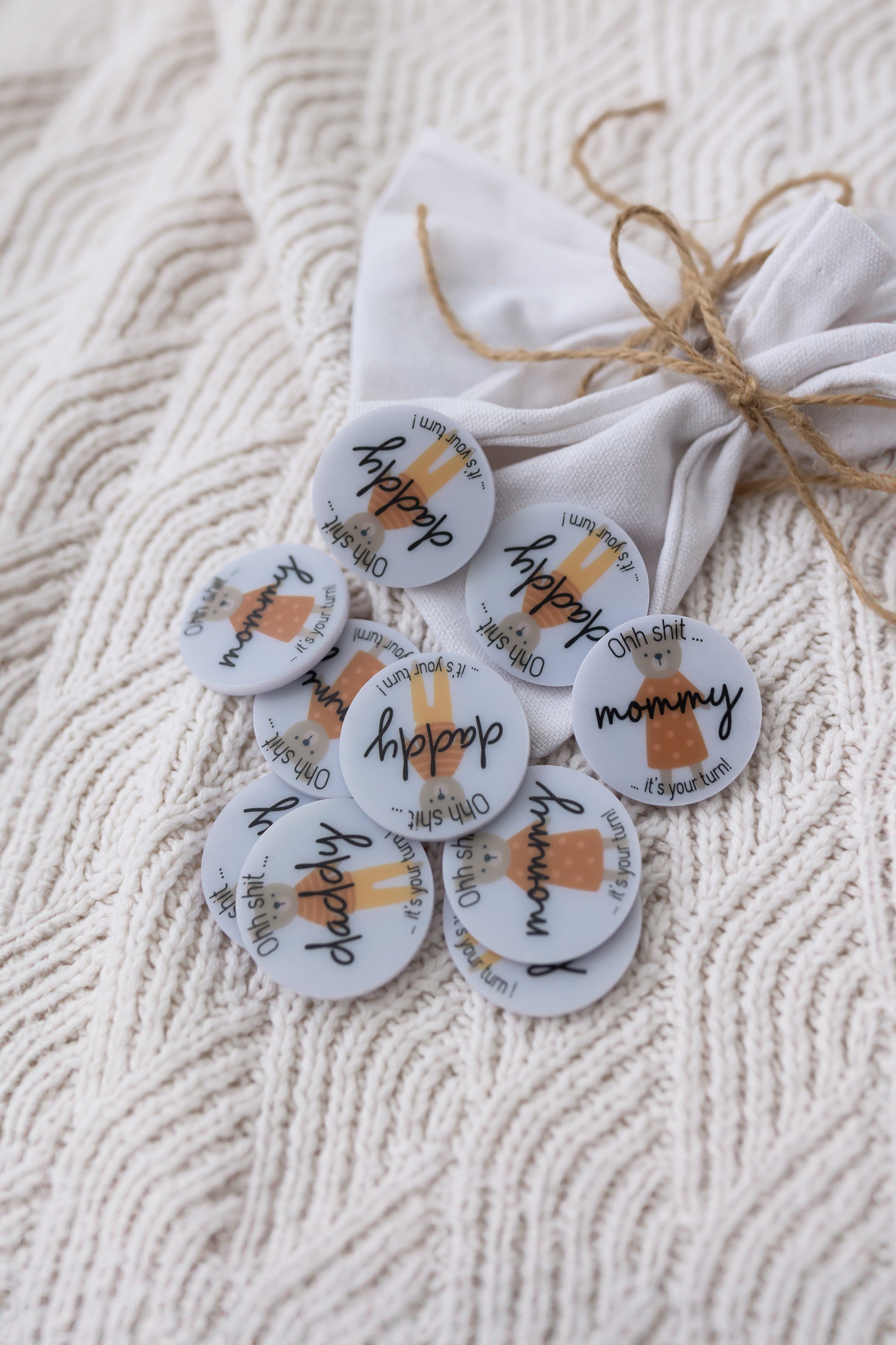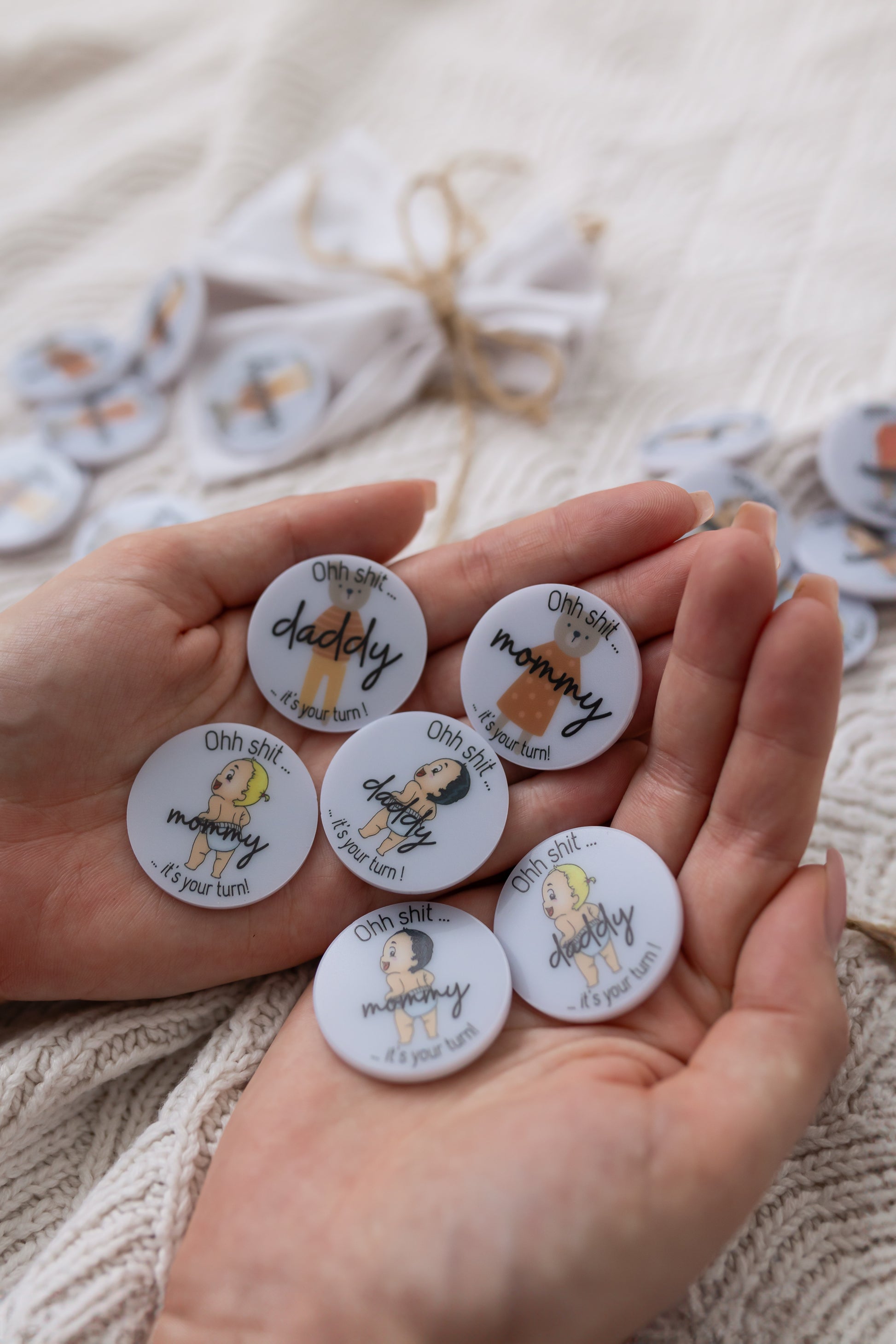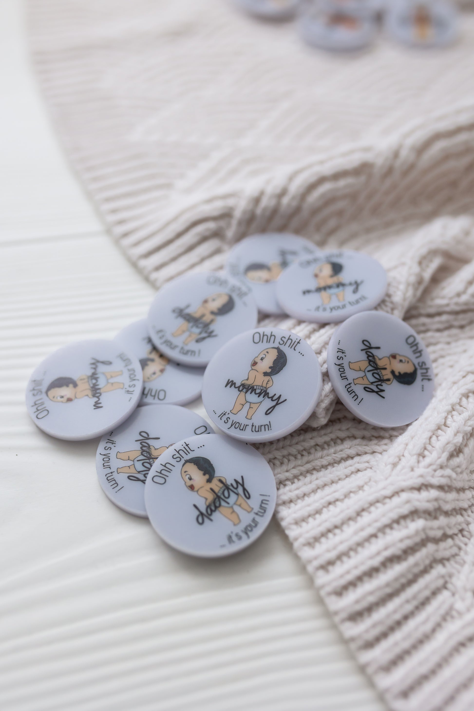 Velikokrat se zgodi, da si ne želiš biti na vrsti za menjavo pleničke. Na zabaven način določita kdo je tokrat na vrsti. Žeton usode vama bo pri tem pomagal. Odločil bo ali je na vrsti mami ali oči. Idelano kot darilo za babyshower ali ob rojstvu otroka.