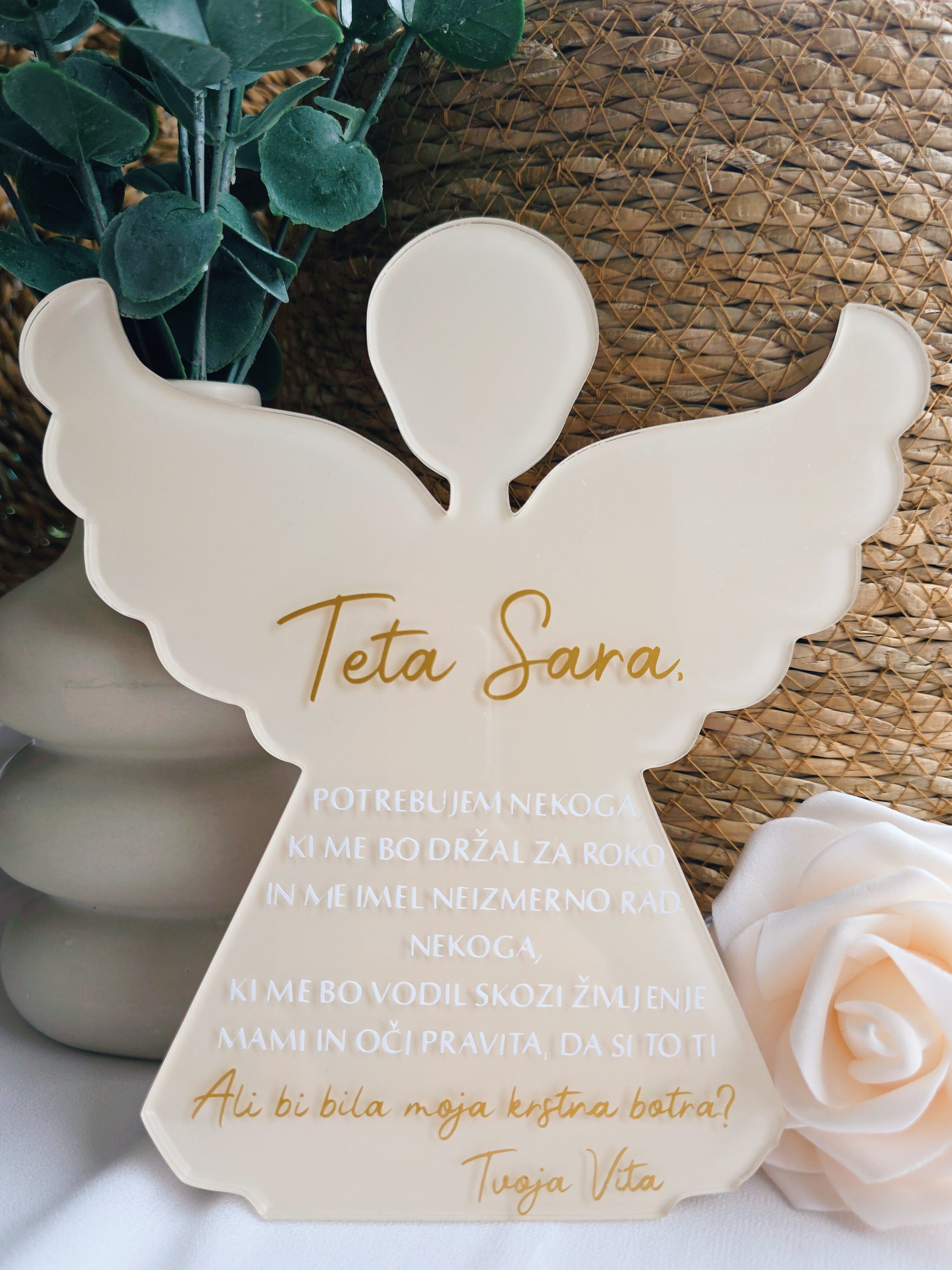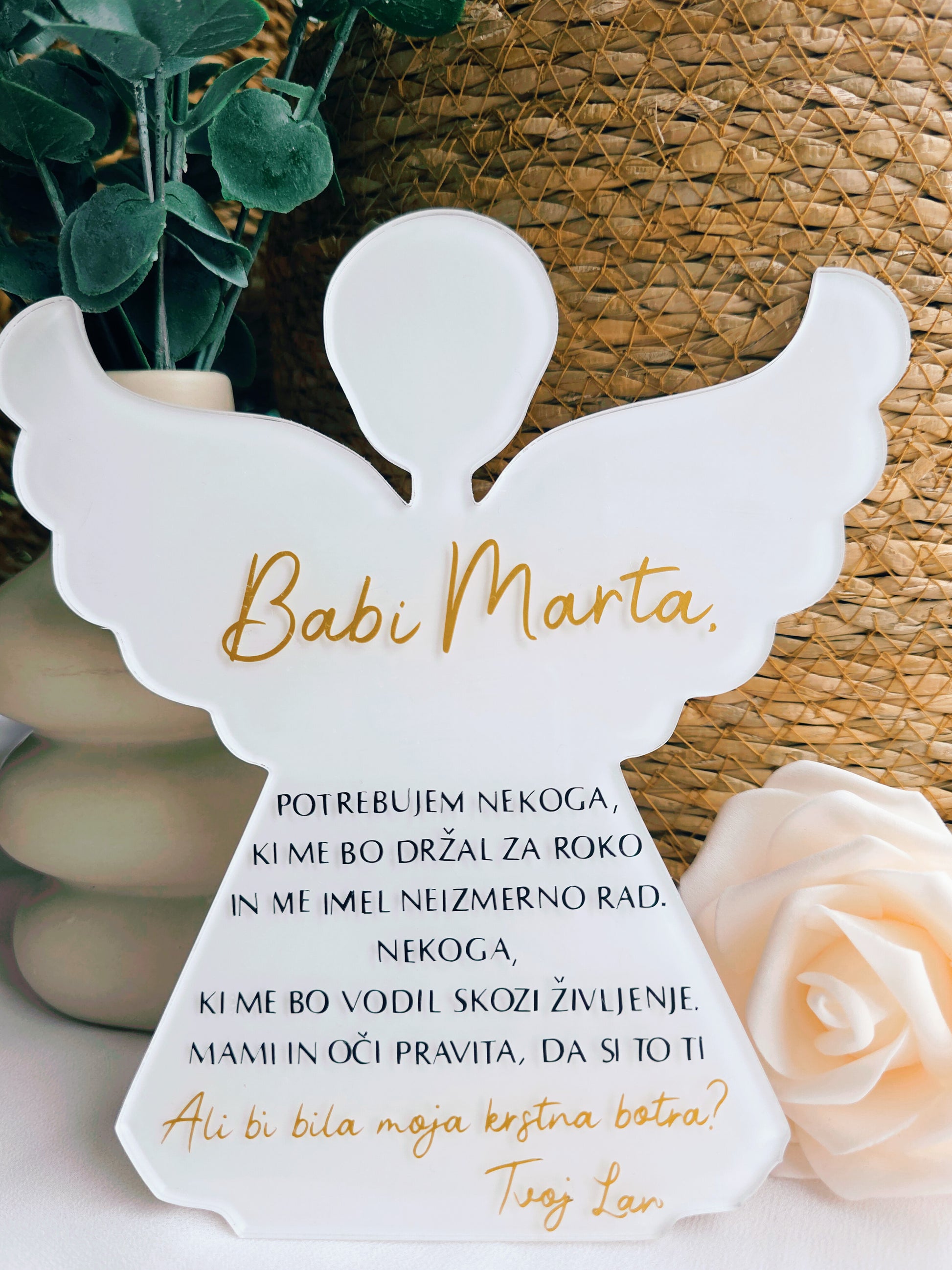 Podarite vprašanje, ki se ga bodoči boter ne bo nikoli pozabil. Naša akrilna ploščica v obliki angelčka je čudovit, simbolen in čustven način, kako povabiti nekoga v pomembno vlogo botra.