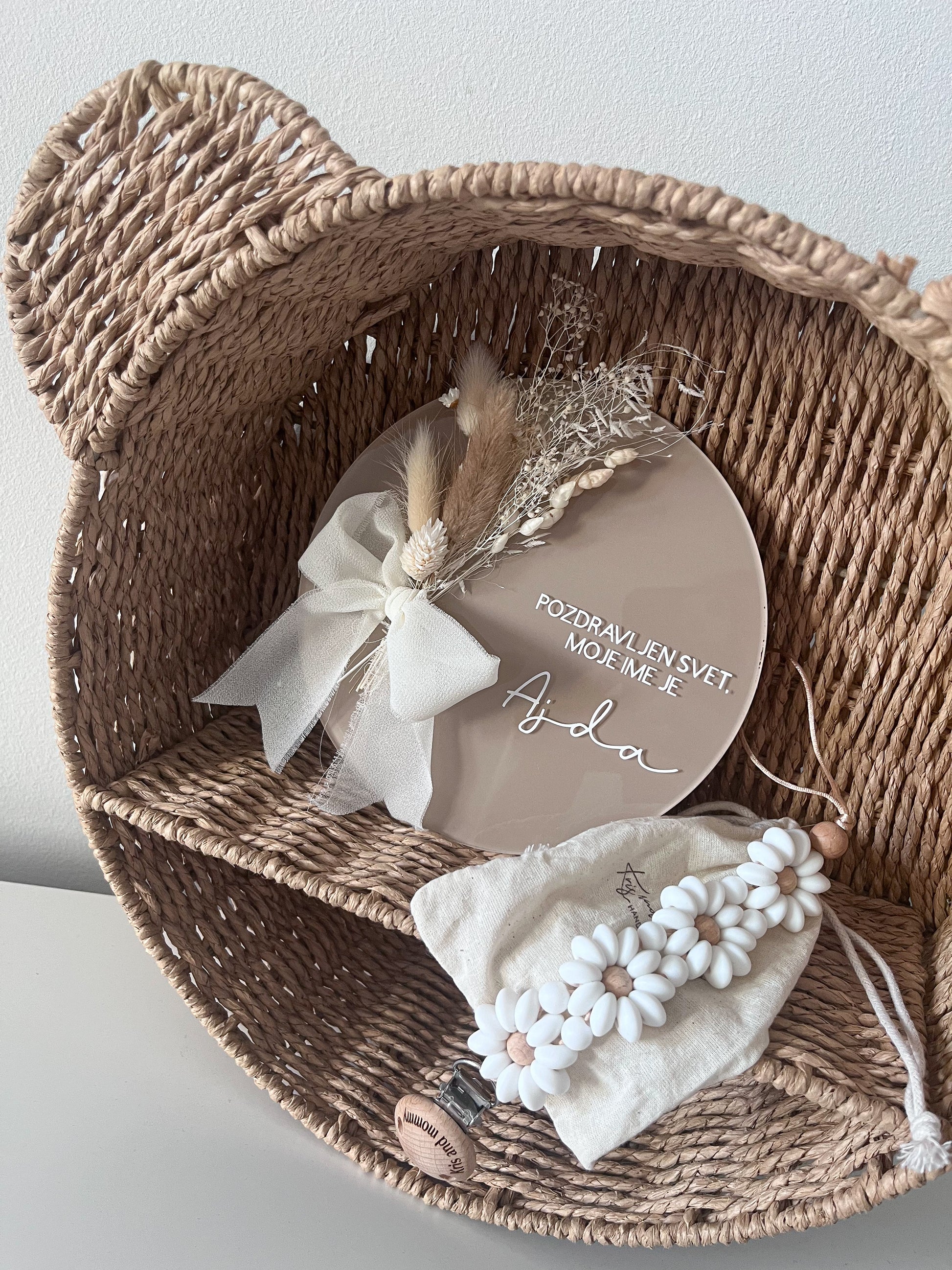 Darilni set je sestavljen iz akrilne oznanitvene ploščice s šopkom suhega cvetha ter Kris and mommy priponke za dudo.