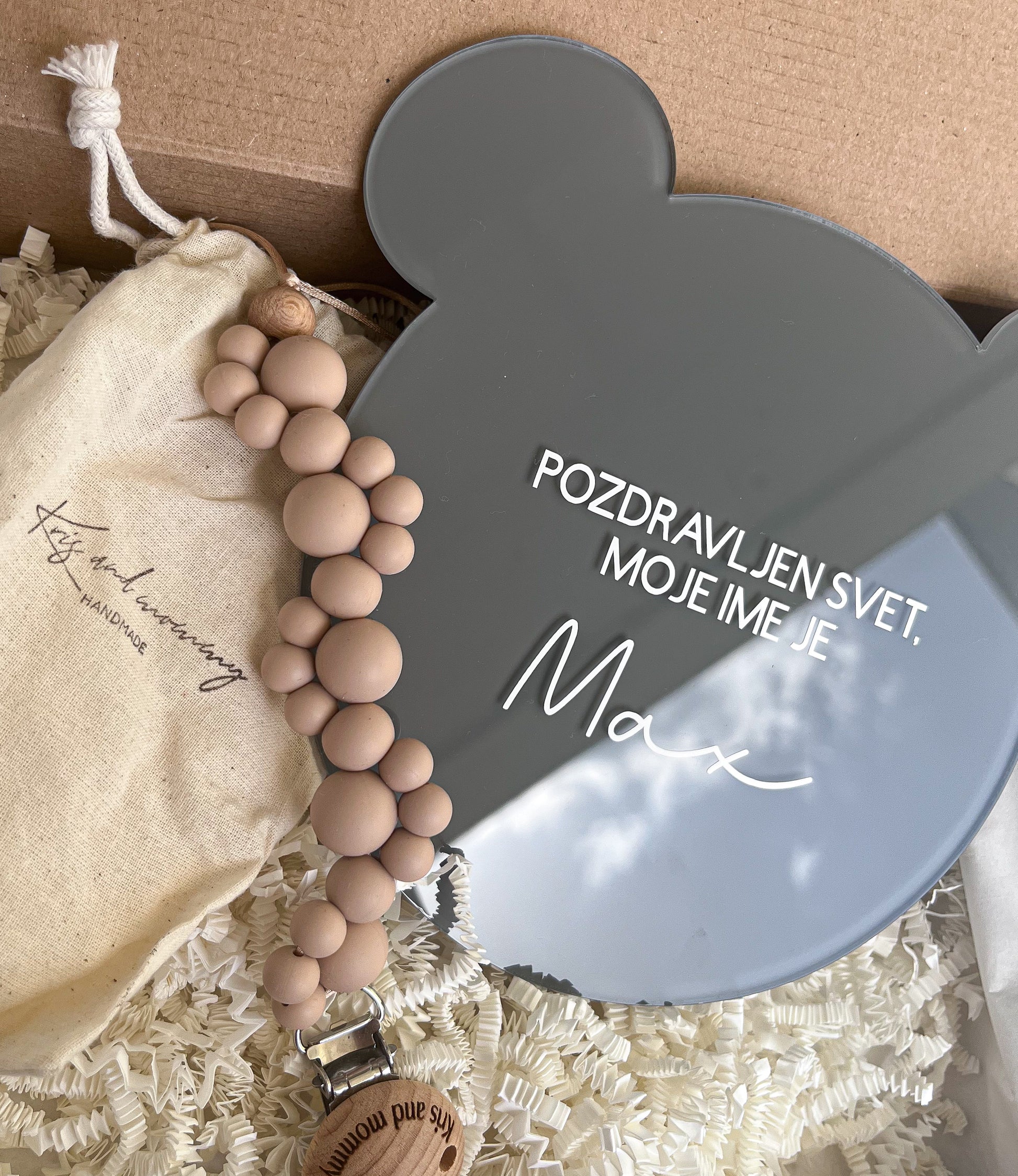 Darilni set je sestavljen iz akrilne oznanitvene ploščice po izbiri ter Kris and mommy priponke za dudo.