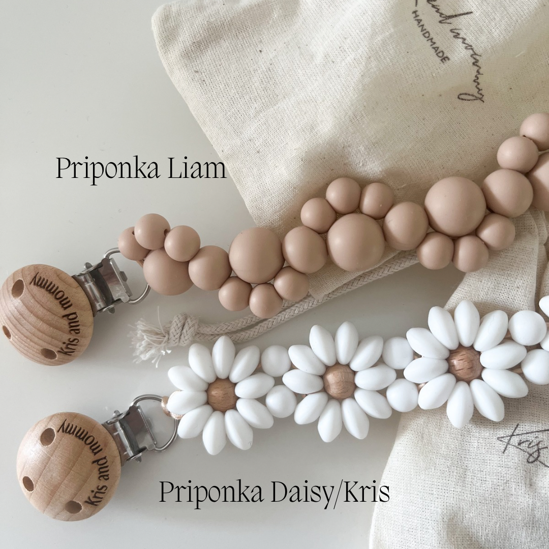 Priponka za dudo je ročno izdelana iz silikonskih in lesenih bukovih perlic. Priponka je vsestranska, brezčasna in praktična. 100% silikon za hrano, brez BPA, svinca, ftalatov in kadmija. Vrvica je najlonska. Približna dolžina priponke vključno s sponko je 21cm. Priponke so delo malega slovenskega podjetja Kris and mommy. Na voljo sta dve priponki, in sicer: bela Daisy/Kris ali bež Liam.