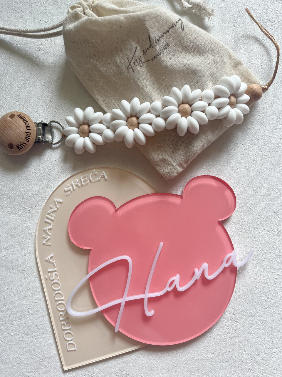 Darilni set je sestavljen iz akrilne dvojne oznanitvene ploščice ter Kris and mommy priponke za dudo.