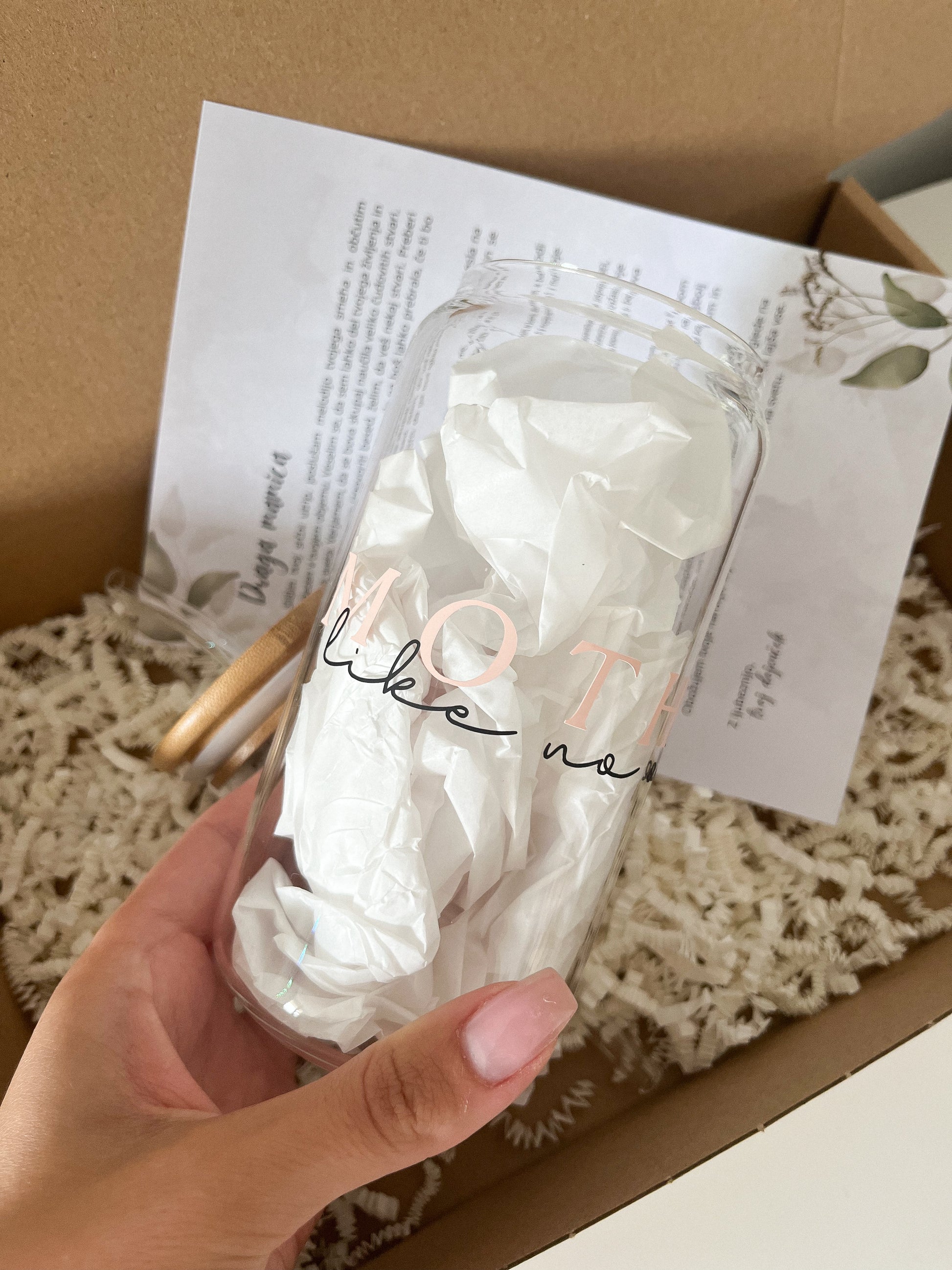 Darilni set vsebuje stekleni kozarec s slamico z napisom po vaši želji in pismo dojenčka, ki ga bo mamica vsekakor potrebovala.