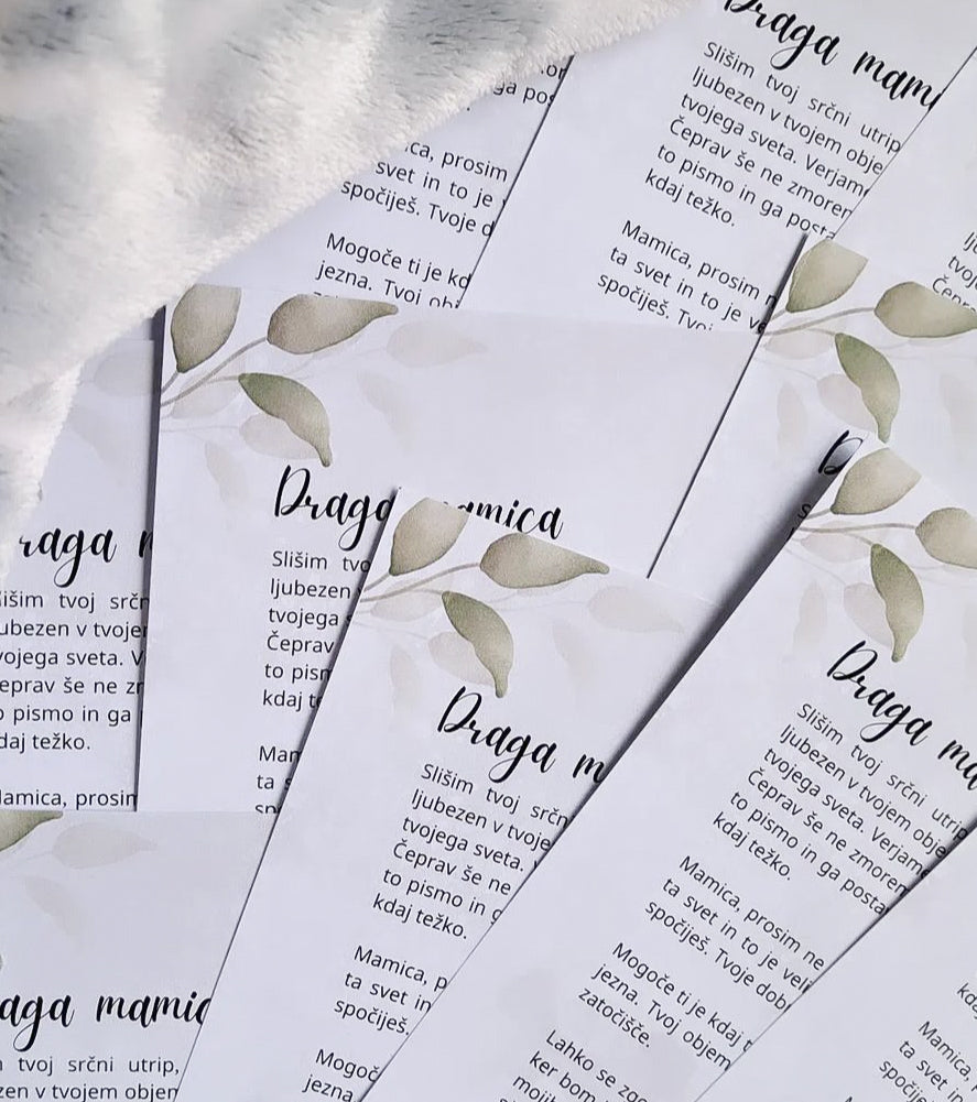 Pismo pa ji bo v oporo ob njenih težkih trenutkih. Napisano je skozi oči dojenčka, ki ji pove, da jo ma neizmerno rad, je najboljša ter, da so stvari, ki se dogajajo normalne. Priporočamo, da ga postavijo na mesto kjer ga bodo lahko vsak dan videle.