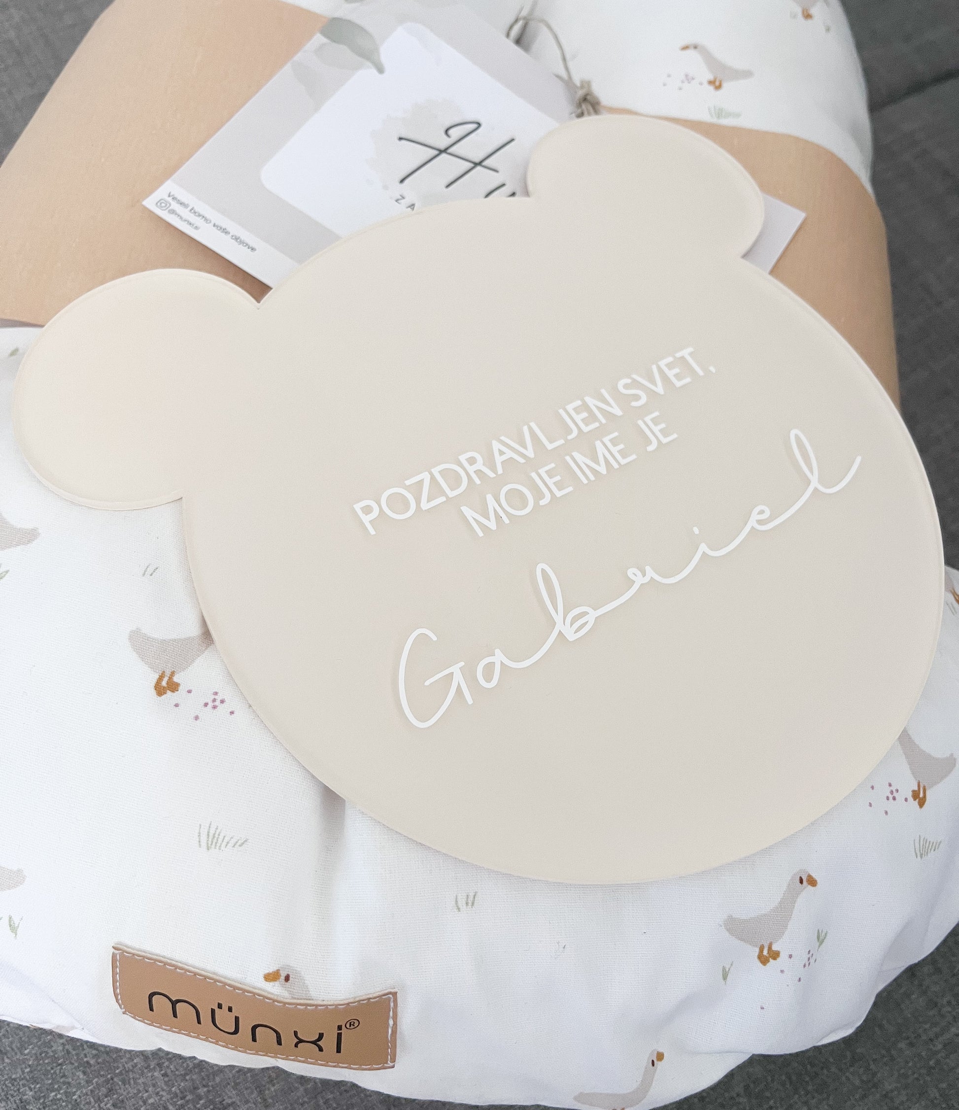 Darilni set je sestavljen iz akrilne oznanitvene ploščice (krog, balon, zmaj ali medo) ter Münxi oporne blazine.