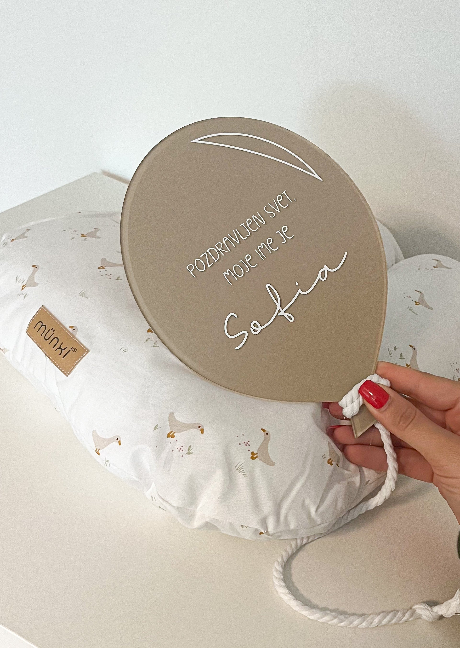 Izberite katero obliko, barvo in napis za akrilno oznanitveno ploščico želite. V okvirček dopišite ime, katero napišemo na ploščico. Izberite tudi katero oporno blazino damo v darilni set. Za drugačne želje nam pišite na info@lapin.si.