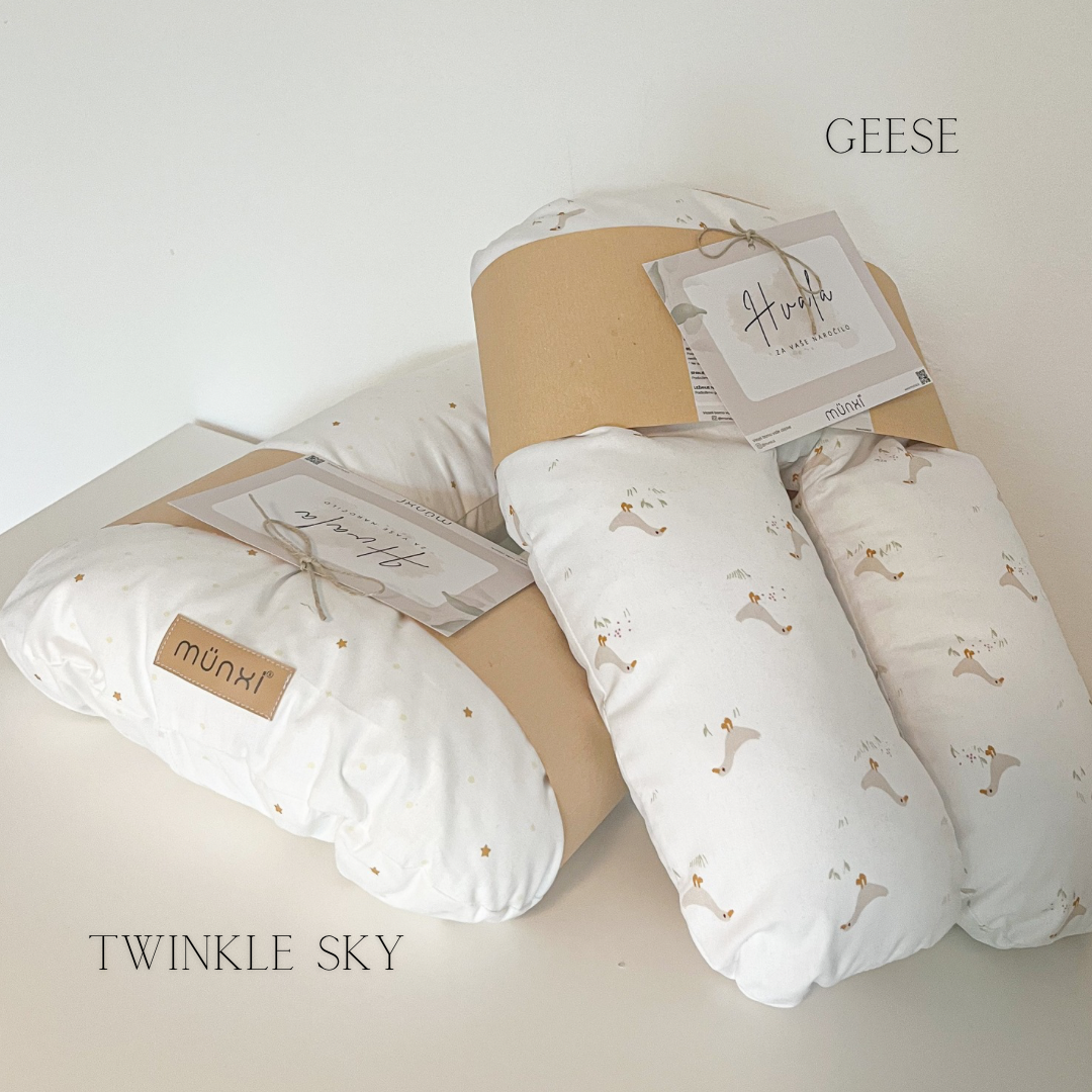 Oporne blazine Münxi so po nasvetih fizioterapevtov izdelane ročno iz materialov (Prevleka: 100 % bombaž,polnilo: 100% poliester), ki ne škodujejo zdravju in so namenjene za spanje novorojenčkov na boku. Pri spanju je novorojenčke potrebno podlagati do približno 3.meseca starosti oz. dokler si sam ne izbere spalnega položaja. Z blazinco lahko spi tudi na hrbtu tako, da se mu posložita nogici, za igranje se mu lahko blazinica namesti pod glavo in je tako rahlo dvignjen, ali pa se mu namesti pod trebušček. Izbirate lahko med dvema blazinicama: GEESE in TWINKLE SKY.