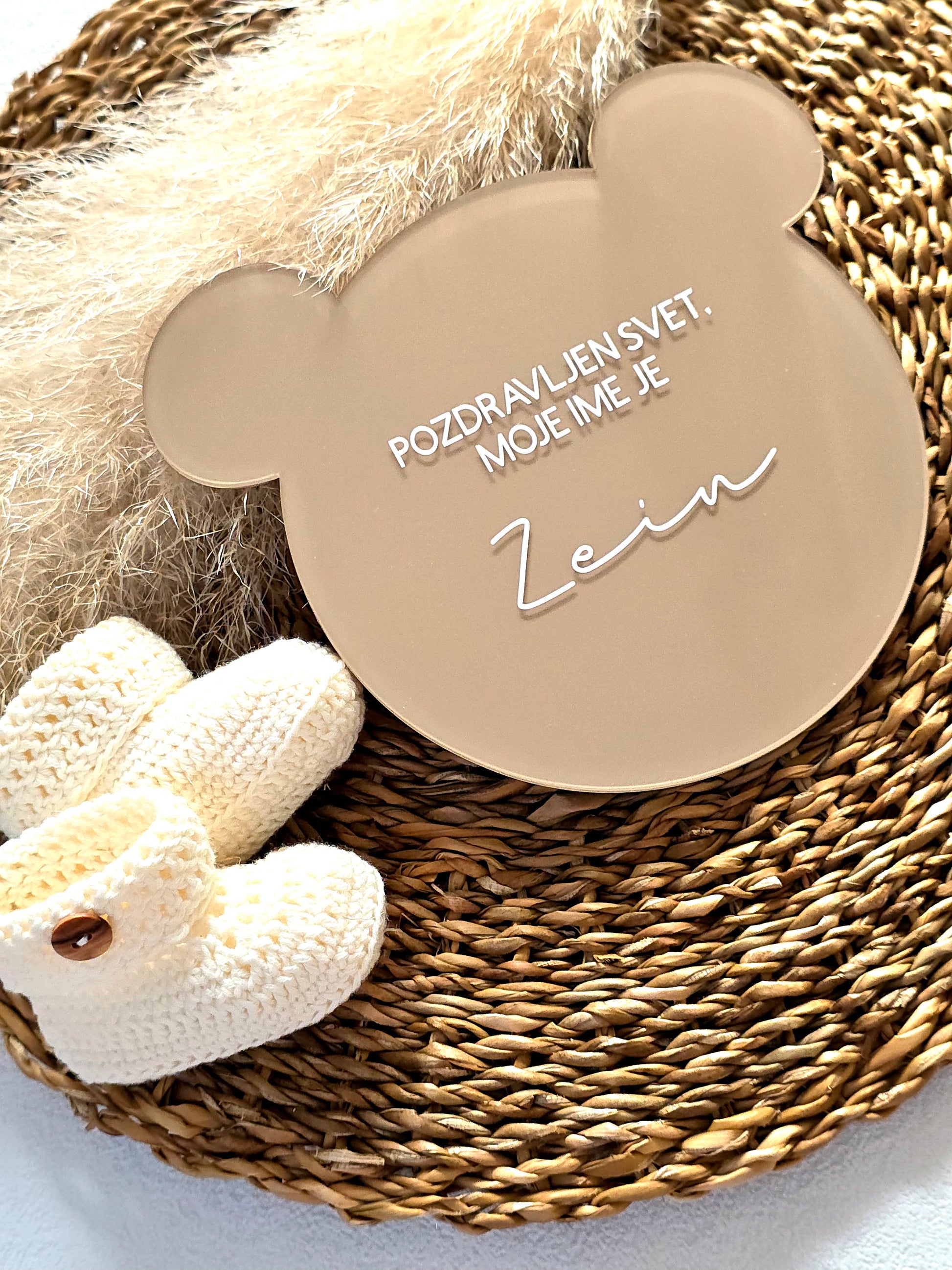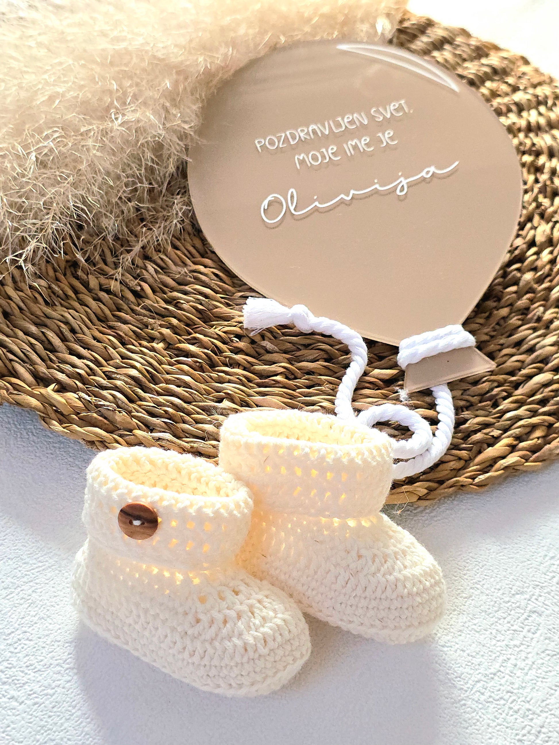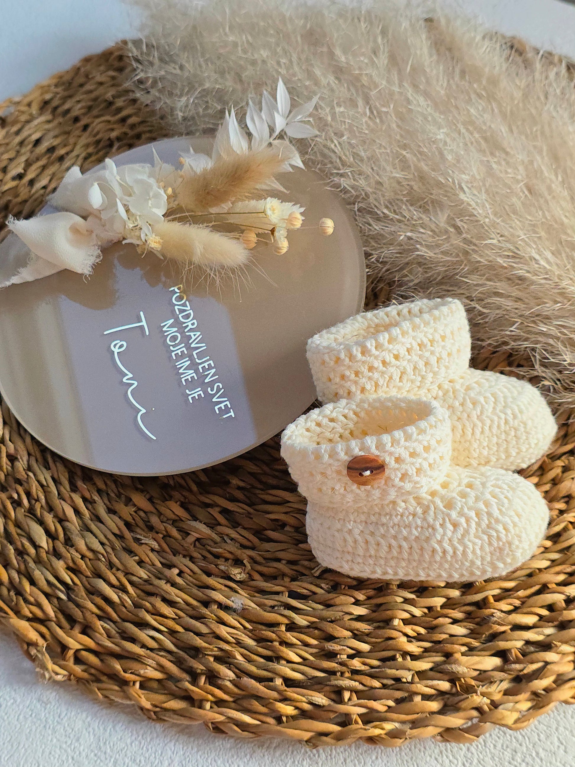 Darilni set je sestavljen iz akrilne oznanitvene ploščice (krog s šopkom, balon ali medo) ter iz kvačkanih copatkov ustvarjalke Polona kvačka.