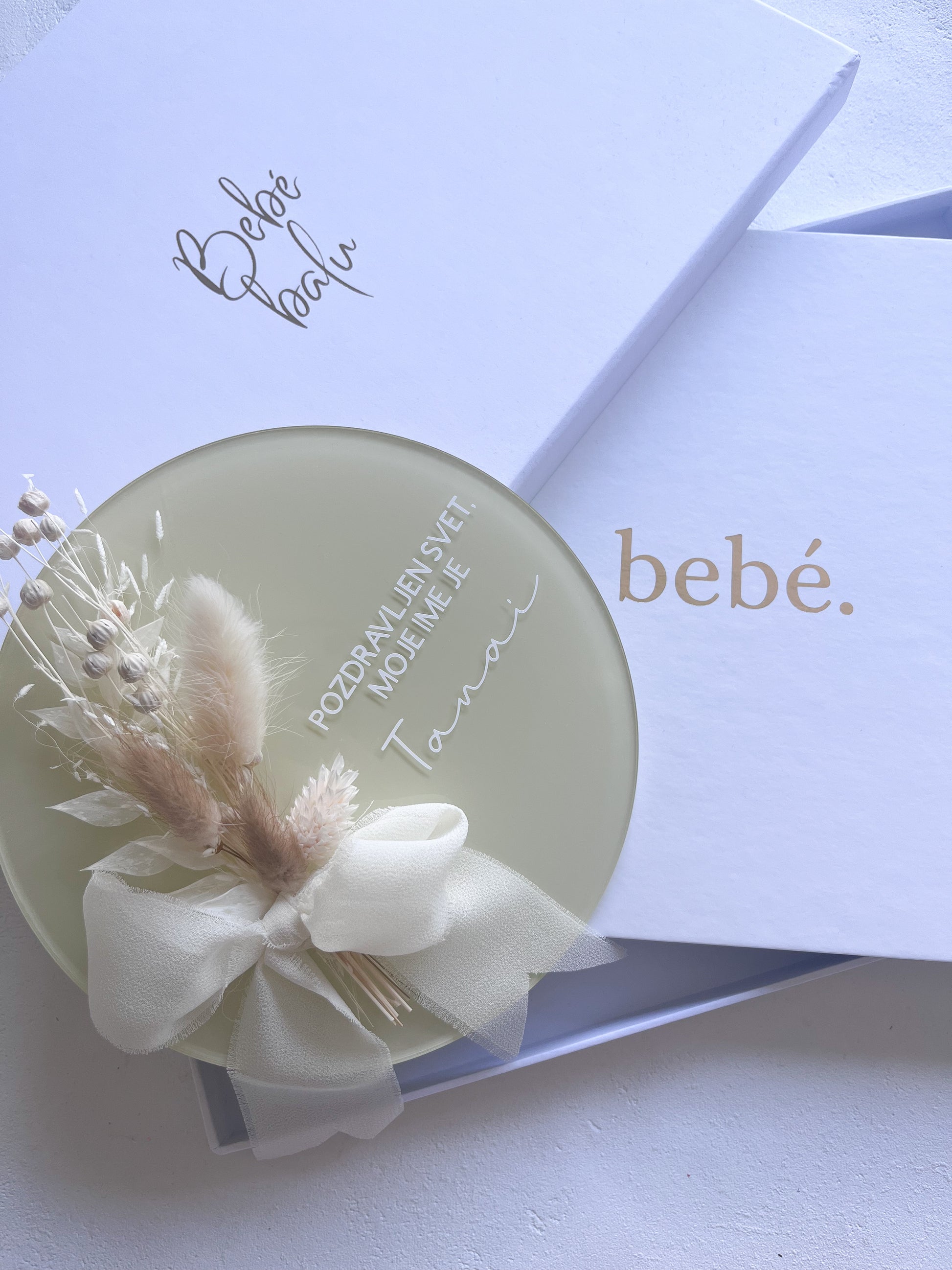 Popolni darilni set za dojenčka. Razveselite z njim bodoče oz. novopečene starše. Darilni set vsebuje akrilno oznanitveno ploščico s šopkom suhega cvetja in bel dojenčkov album Bebé Balu.