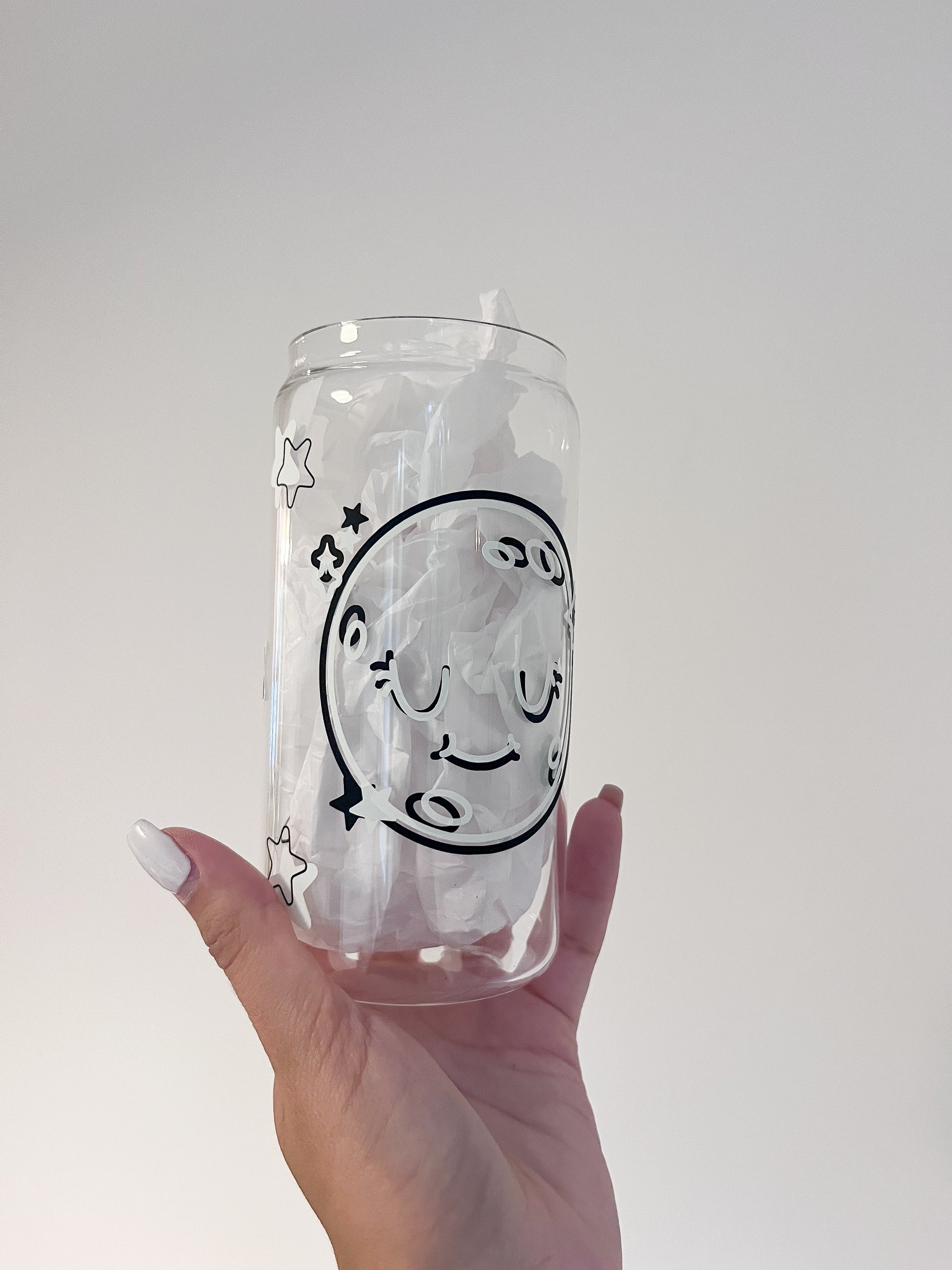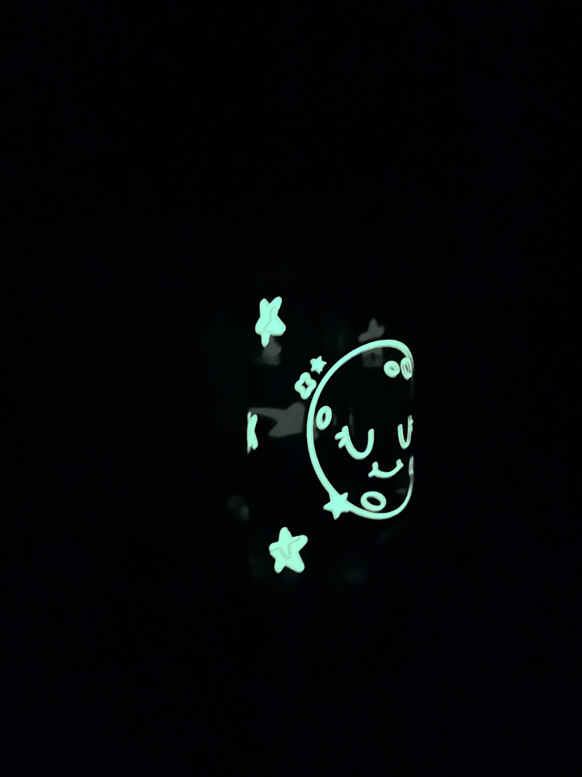 Stekleni kozarec s stekleno slamico z vzorcem lune in zvezdic, katere v temi svetijo. Kozarec lahko malček uporabi za svojo najljubšo pijačo. Napis je izdelan iz vodoodporne vinilne folije. Priložena je ščetka za pomivanje slamice. Kozarec ima volumen 550ml.