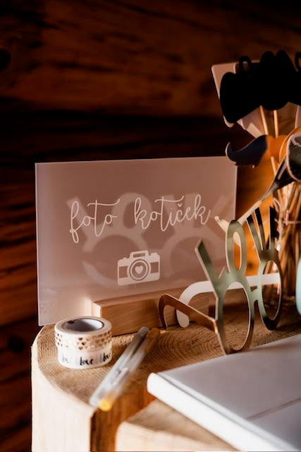 Namizna akrilna tablica za poroke. Za označitev foto kotička, sladkega kotička in mize s palčkami, ki se iskrijo.