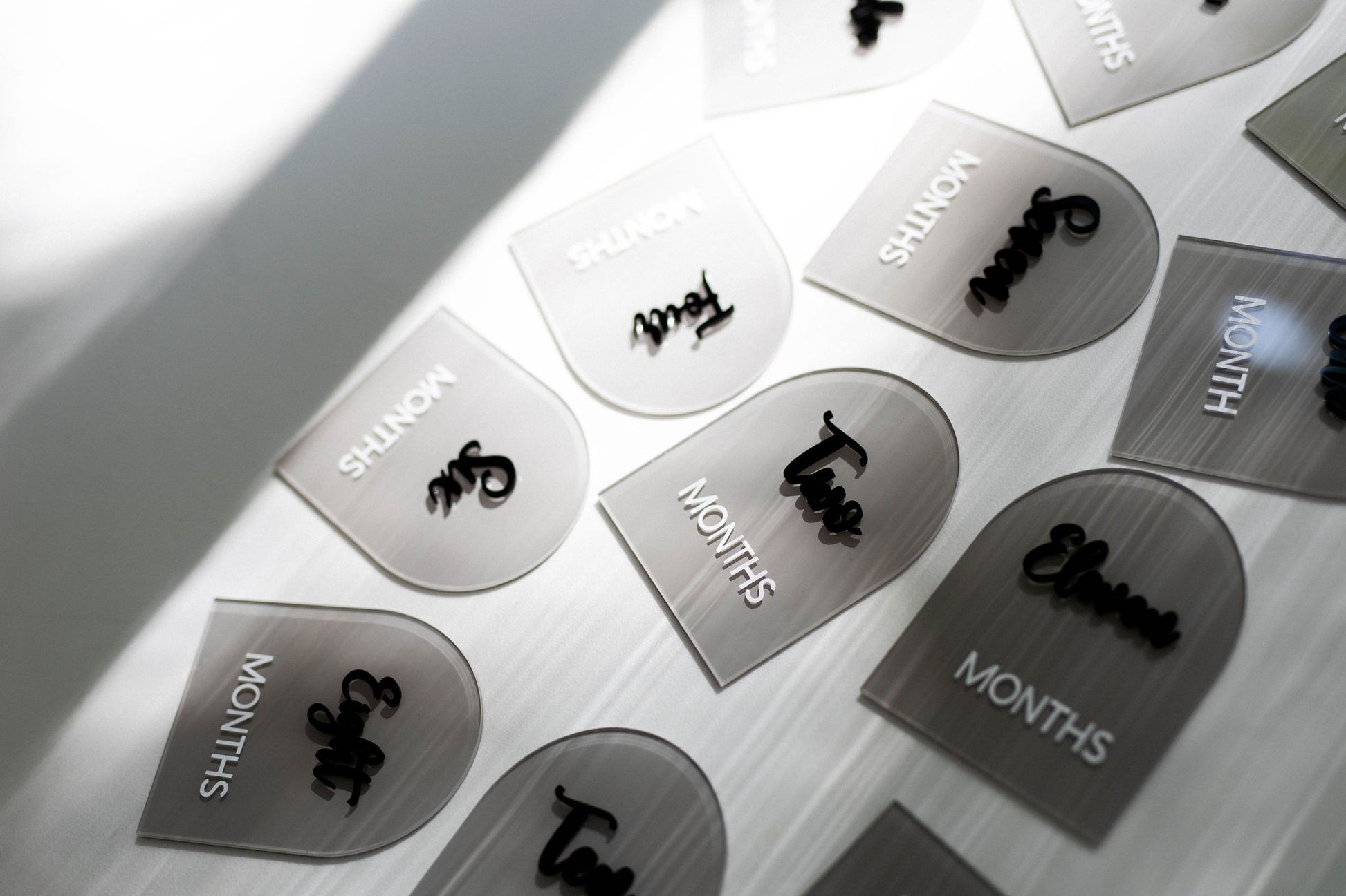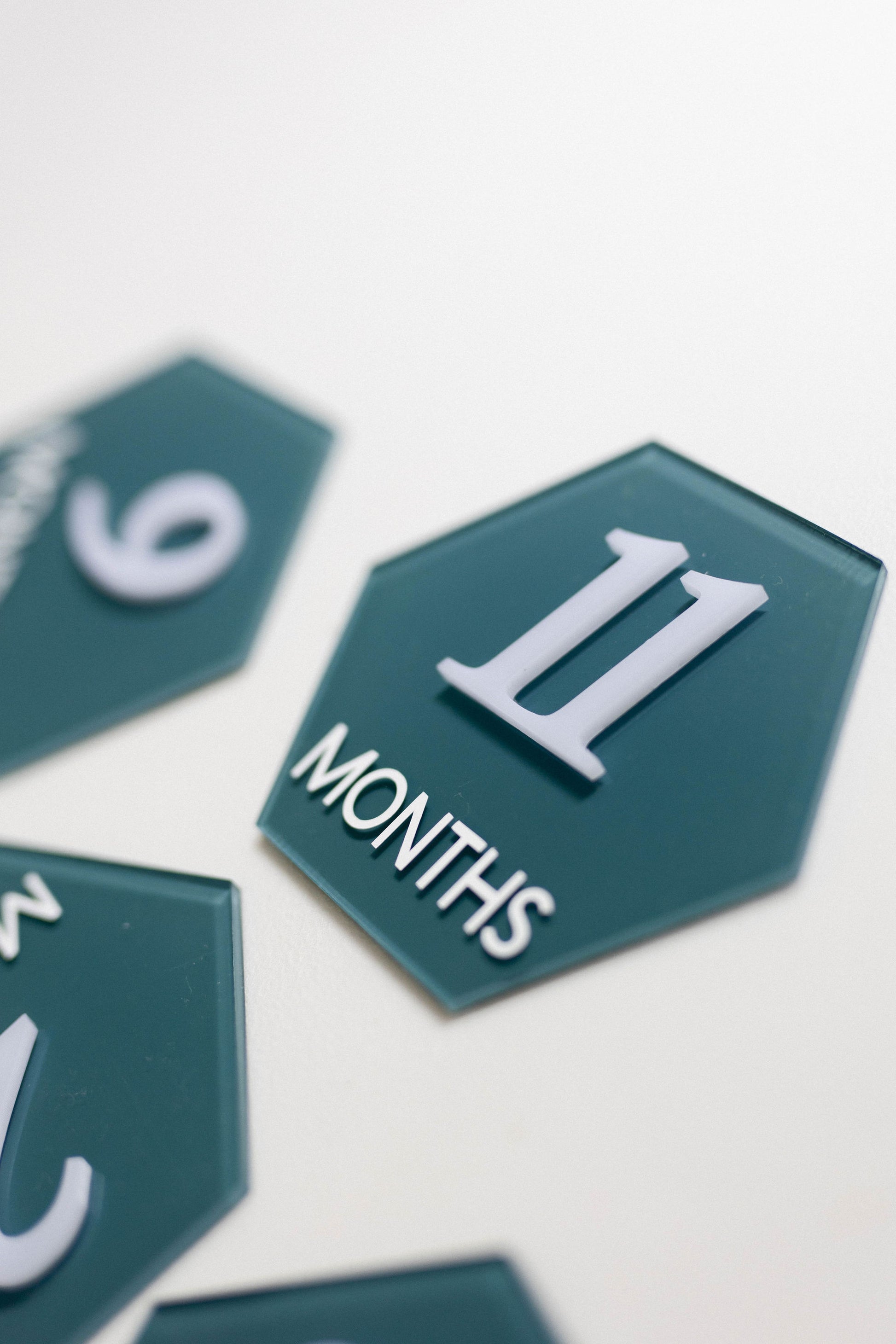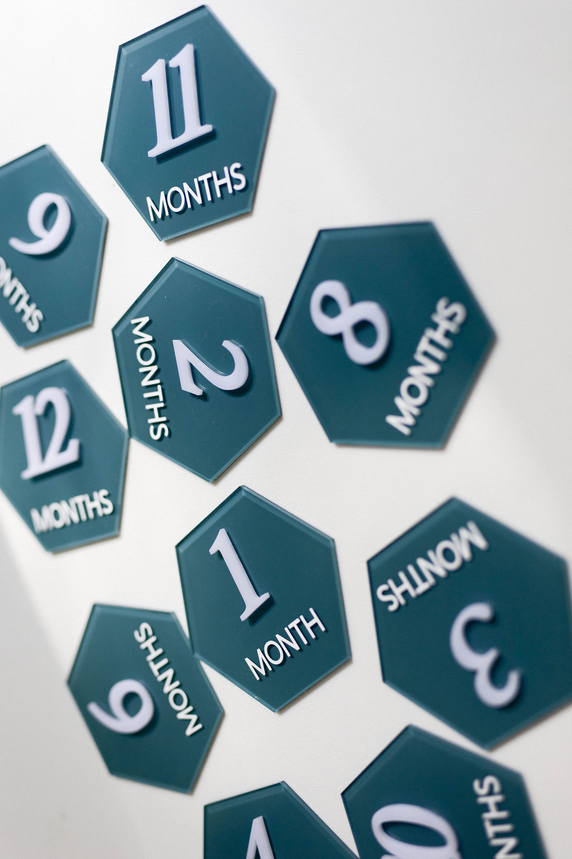 Izberite barvo in obliko ploščice ter 3D dela (ki je lahko v zlati, stebrni, beli ali črni barvi). Besedilo “MONTH/S” je napisano v beli barvi. Izberite si tudi ali želite imeti mesece ki so narejeni iz akrilnega stekla napisane s številko ali besedo. Ploščice so izdelane v angleškem jeziku. Za drugačne želje nam pišite na info@lapin.si.
