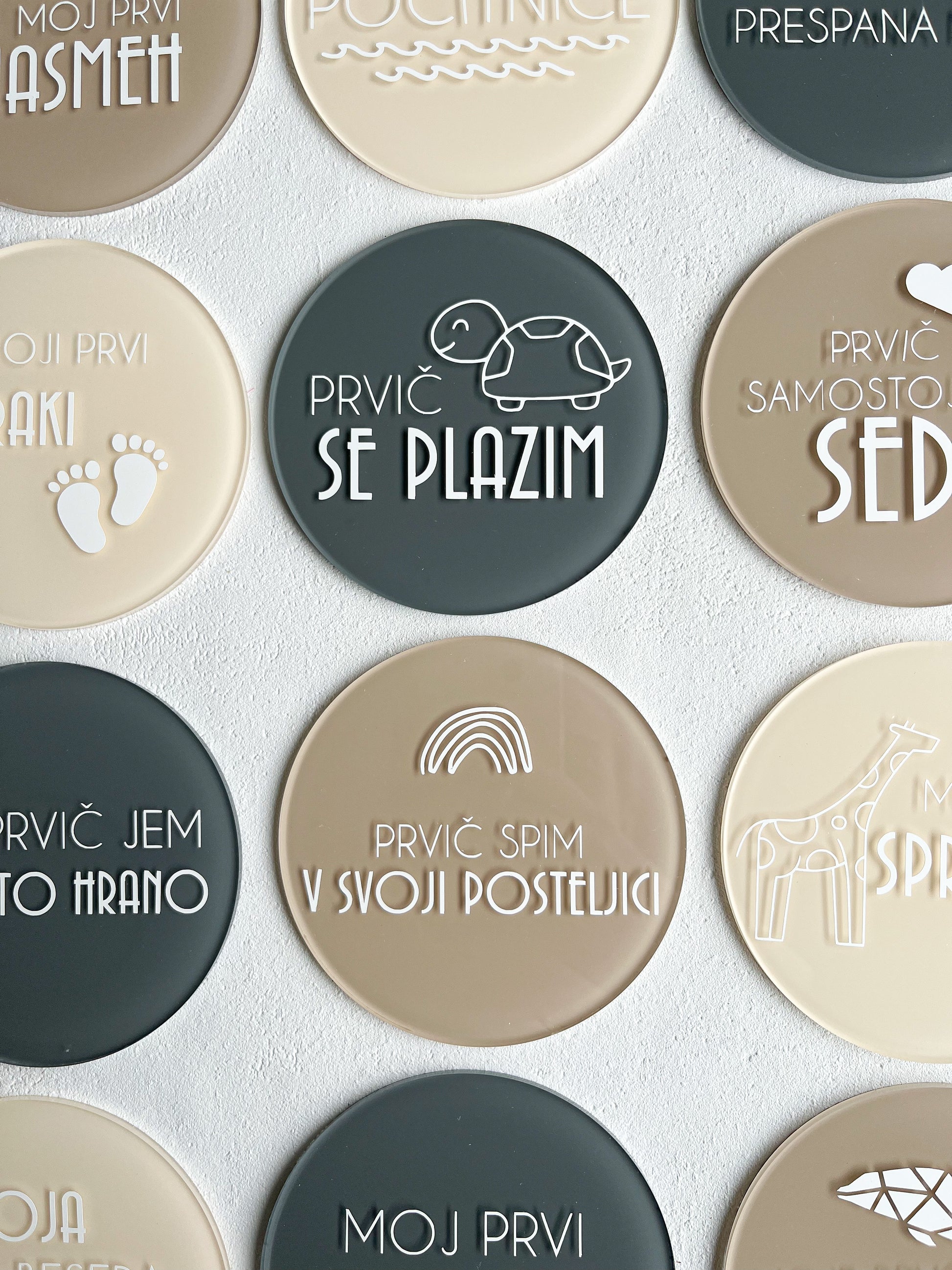 Popolni set akrilnih ploščic za fotografiranje prvih trenutkov Vašega otroka. Z njimi ustvarite unikaten, trajen spominek na zgodnje otroške trenutke. Naj bo vsak mejnik poseben in dokumentiran.